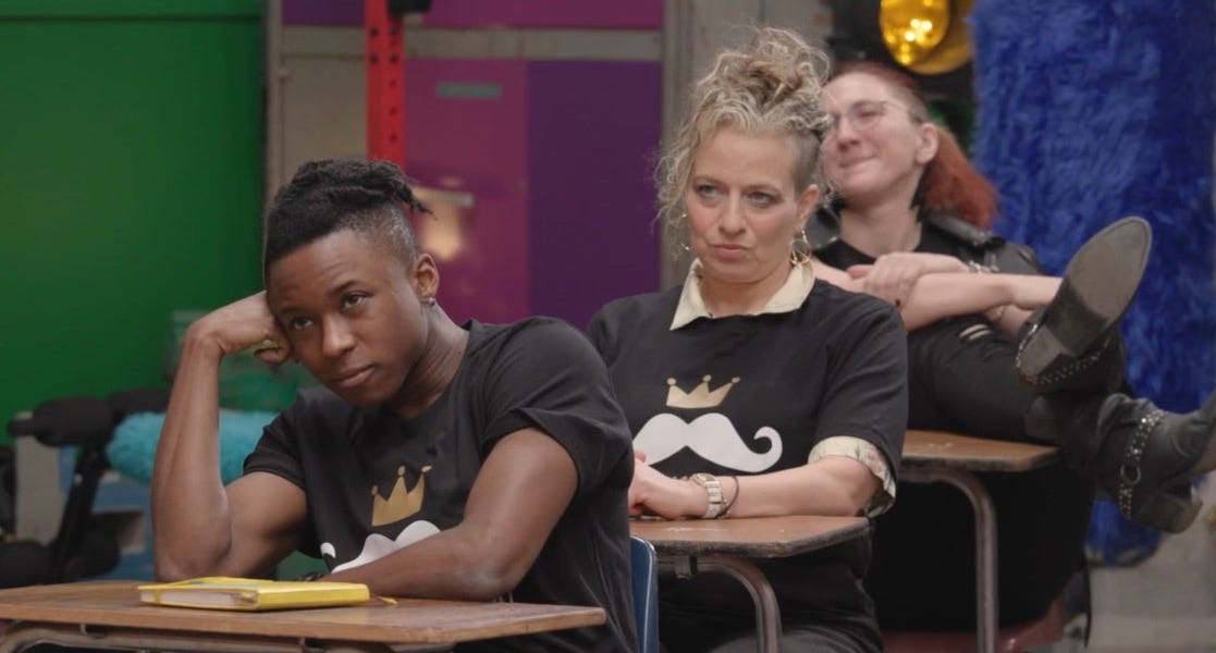 And so it came to pass that the writer found hirself in a room full of other lesbians,1 former lesbians, and generally lesbian-esque individuals. We were gathered in the Black Box theater at the Rockwell to Clown. Our Clown in Chief was one Big D, made lesbian-famous by King of Drag, the first-ever drag king competition show airing exclusively with ads on Revry TV with a prize one-twenty-fifth that of RuPaul’s Drag Race. She dressed atrociously clownishly, in iridescent gold leggings and a flannel made up of two different flannels cut down the center and stitched back together in Barney purple and green.